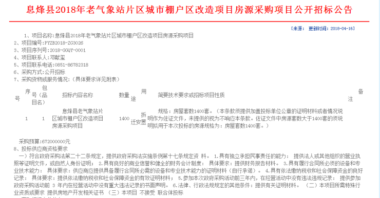 16日,记者从息烽县房屋征收局了解到,息烽县房屋征收局对息烽县老气象站片区城市棚户区改造项目房源采购项目进行公开招标。