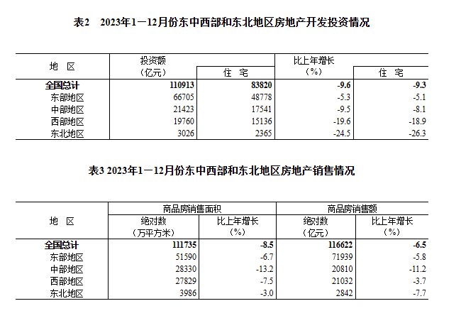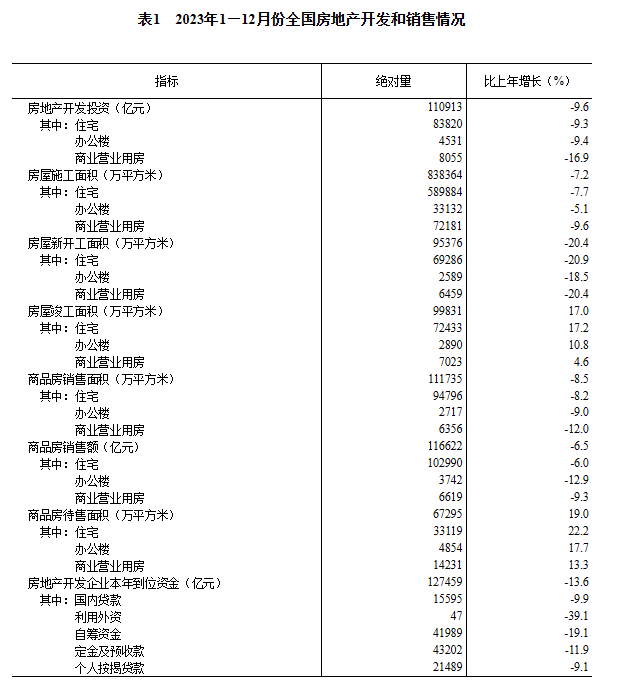 2023年全国房地产开发投资110913亿元 比上年下降9.6%