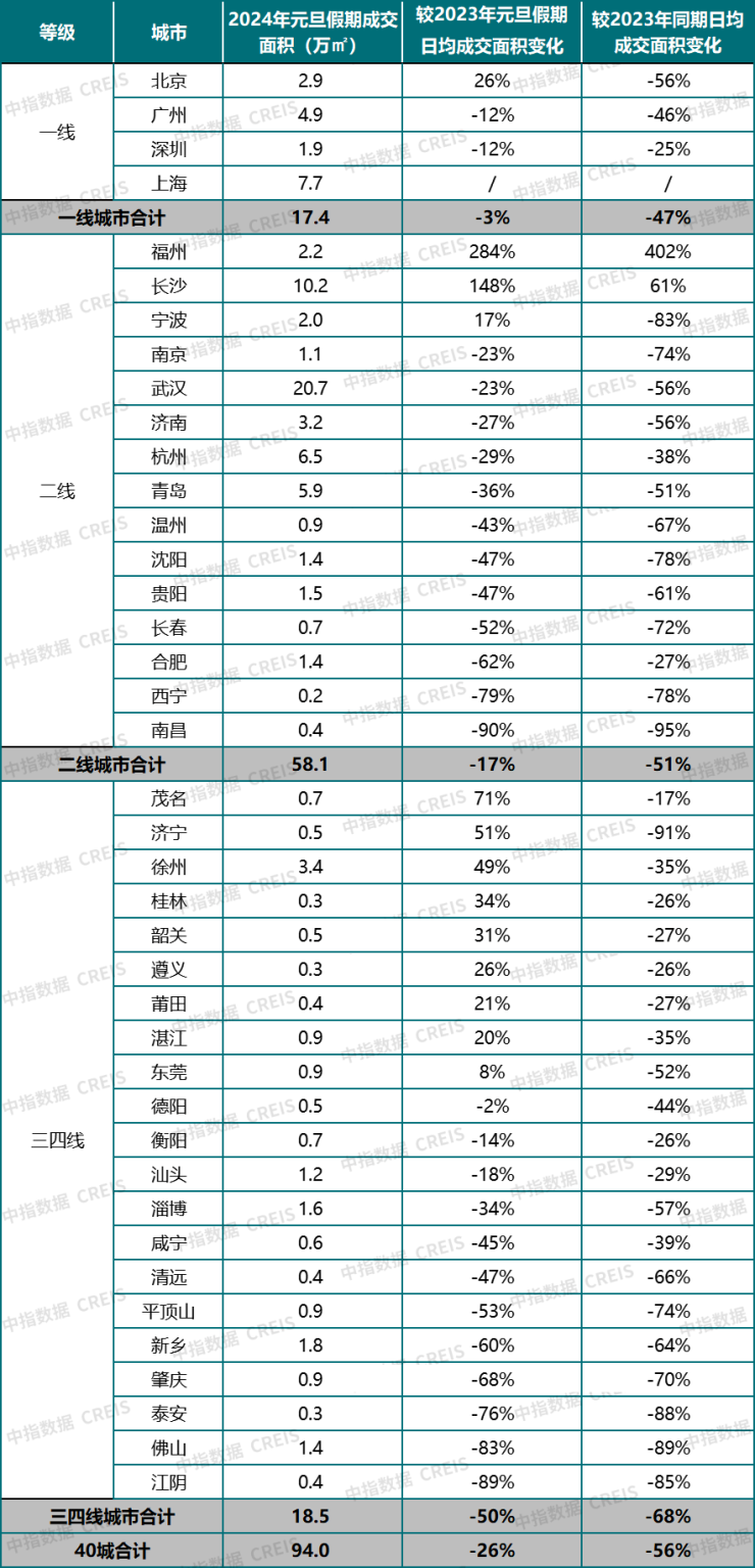 根据第三方机构中指研究院监测数据,2024年元旦假期期间(2023.12.30-2024.1.1),40个代表城市新建商品住宅日均成交面积较上年元旦假期(2022.12.31-2023.1.2)降幅超两成。