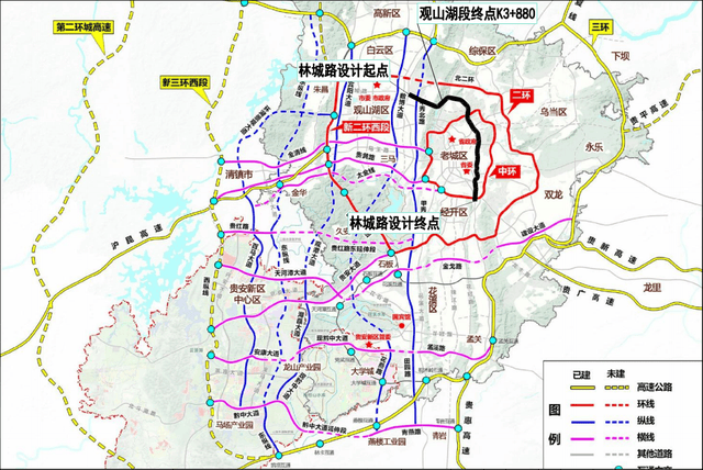 林城东路延伸段:总投资约200亿元,将向北延伸连接白云新城,形成“金融城—小龙滩—南明”城市发展轴,目前林城东路延伸段已正式展开房屋征收启动工作。