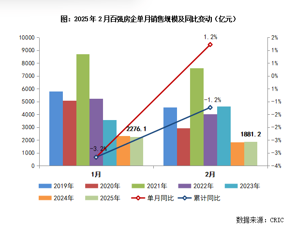 2025年2月,中国房地产市场延续止跌回稳态势,叠加春节假期因素影响,整体保持低位运行。2月,TOP100房企实现销售操盘金额1881.2亿元,同比增长1.2%,单月业绩规模保持在历史较低水平。