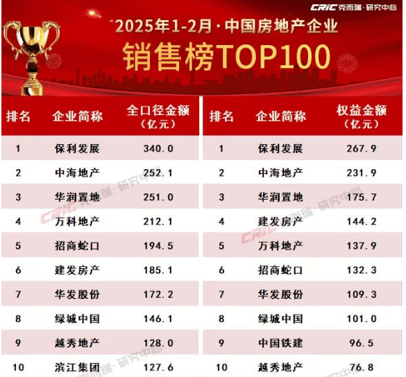 3月3日,据克而瑞地产研究中心发布的报告数据,今年前两个月保利发展以全口径销售额340亿元位居第一,紧随其后的两名分别为中海地产和华润置地,销售额分别为252.1亿元和251亿元。
