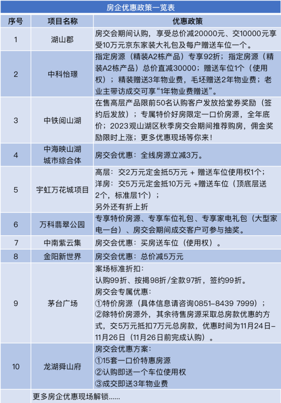 据悉,为期3天的秋季房交会汇聚了观山湖区的在售楼盘,包含了湖山郡、观山湖西部片区、茅台广场、中科怡璟、中铁阅山湖、阅山湖·云著、阅山湖·臻藏、龙湖·舜山府、中海映山湖城市综合体、宇虹万花城项目、金茂观山湖城市综合体、远大观山府、金阳新世界、保利时代、万科翡翠公园、中南紫云集等众多楼盘。