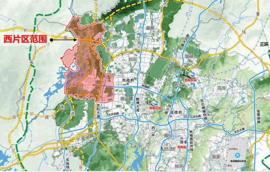 观山湖区西部片区范围包含观山湖区朱昌镇全域、百花湖镇的百花湖村、竹林村以及下麦村、上麦村、阅山湖居委会,总面积约74.18平方公里,占观山湖区全域(307.64平方公里) 24.1%。西片区核心区,东抵环城快铁、南邻金清线、北至窦官安置房,西接百花湖,面积约26.11平方公里,将打造生态百花,未来新城。