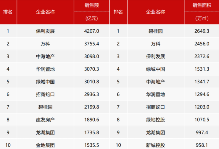 据中指研究院发布的排行榜显示,2023年,保利发展、万科、中海地产销售额分别为4207亿元、3755亿元、3098亿元。而克而瑞研究中心统计数据显示,保利发展、万科、中海地产(全口径)销售额分别为4246亿元、3755亿元、3098亿元。在前三的销售额统计中,保利发展略有差距,“保万海”的排名位次相同。
