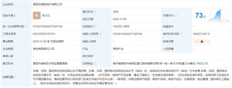 其中,洋浦地产在南明区遵义路街道新设了贵阳洋浦房地产有限公司。