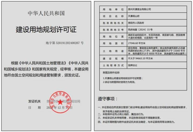 12月12日,据贵阳市自然资源和规划局公示信息,天瀑观山湖新项目——天瀑观山府已获取建设用地规划许可证,前期工作正在推进中。