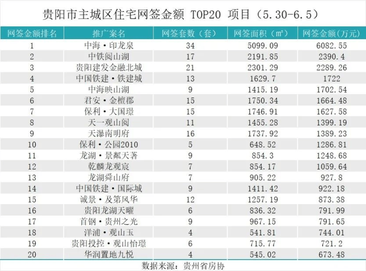 据贵州省房协统计数据,2025年5月30日至2025年6月5日,贵阳主城六区住宅网签金额榜单中: