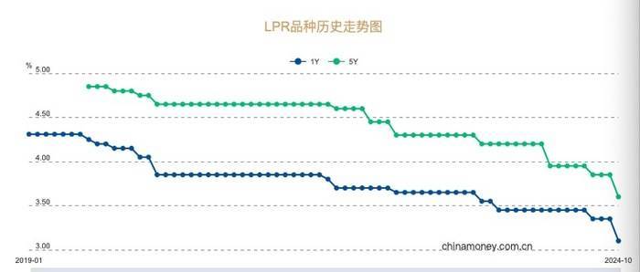 中国人民银行授权全国银行间同业拆借中心公布,2024年10月21日贷款市场报价利率(LPR)为:1年期LPR为3.1%,5年期(简称5年期)以上LPR为3.6%,相比上次均下调25BP。