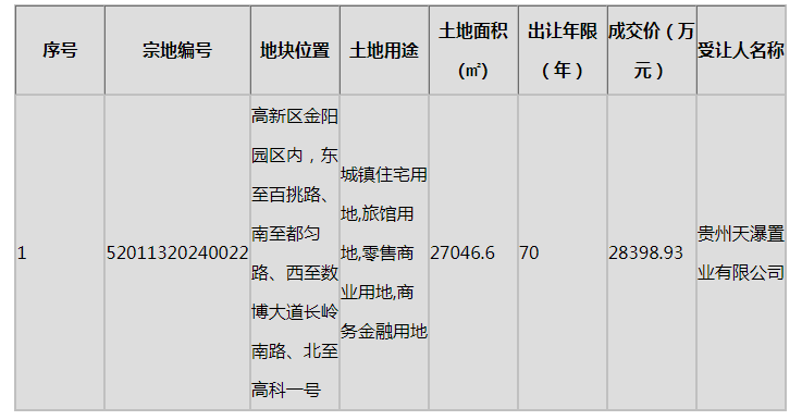 11月1日,据贵阳市公共资源交易中心公示,贵州天瀑置业有限公司拿下贵阳高新区金阳园区内1宗商住用地,出让面积27046.6平方米,总成交价28398.93万元。