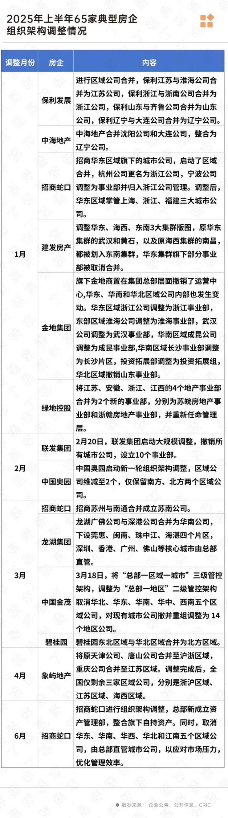 据克而瑞研究中心发布的报告显示,克而瑞监测的65家重点房企情况来看,2025年上半年包括保利发展、中海地产、招商蛇口等在内的头部房企纷纷着手进行重大组织架构调整。