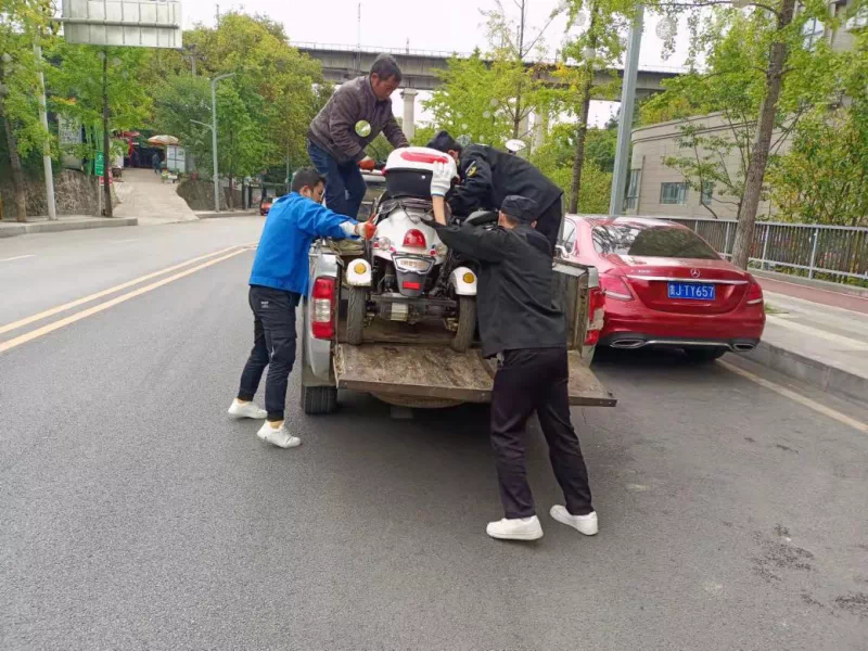 执法人员对车水路沿线不按规定停放的电动车进行拖离