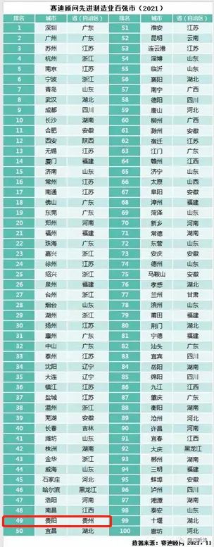在此次发布的先进制造业百强市(2021)榜单中,东部地区有55个城市,东北地区有5个城市,中西部地区有40个城市上榜。上榜的城市中,贵阳排名第49位。