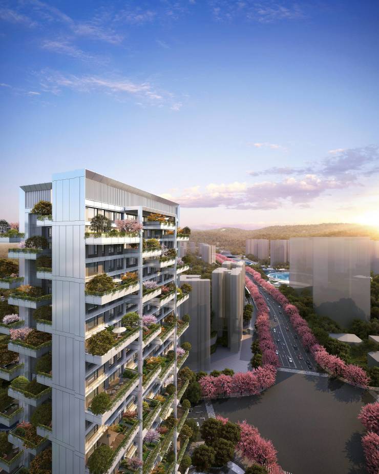 具体来看,悦墅组团地处整个铁建城项目的龙头门户,定位打造 240 万方铁建城入口处的标杆品质住区;组团共规划 6 栋生态住宅,并且延“最美归家路”樱花大道(双向六车道)布局一字排开。同时,东西两侧布局约 300 米的景观绿化带,实现了“栋栋有景观,户户景不同”的视觉体验,南北两侧均能俯瞰山体公园。