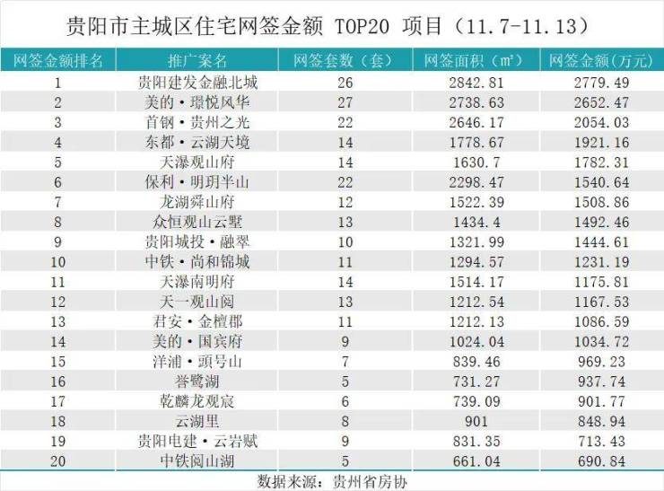 据贵州省房协统计数据,2025年11月3日至2025年11月17日,贵阳主城六区住宅网签金额榜单中: