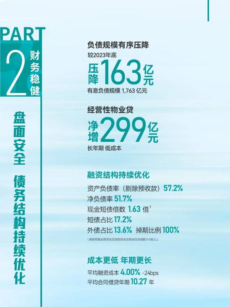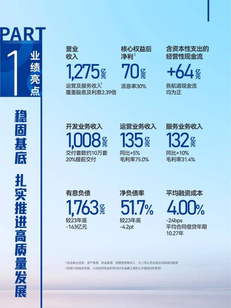 根据业绩报告披露显示,随着政策的回暖,行业正缓慢步入平稳健康发展,龙湖集团表现稳健,2024年全年,营业收入1275亿元,其中开发业务收入1008亿元,运营业务收入135亿元,服务业务收入132亿元;负债规模有序压降,较2023年底压降163亿元。