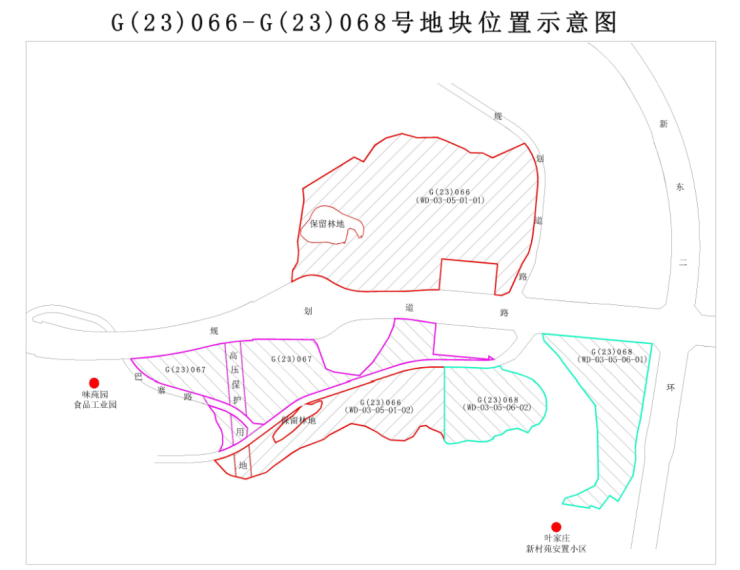 G(23)068号地块分为东(规划编号WD-03-05-06-01)、西(规划编号WD-03-05-06-02)两个部分,实际出让面积40283平方米,计容建筑面积88515.7平方米。
