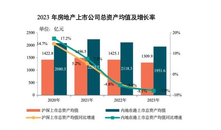 其中,沪深上市房地产公司总资产均值为1309.9亿元,较上年下降8.1%,降幅较2022年扩大3.3个百分点;内地在港上市房地产公司总资产均值为1951.6亿元,同比下降7.9%,降幅较2022年扩大2.6个百分点。