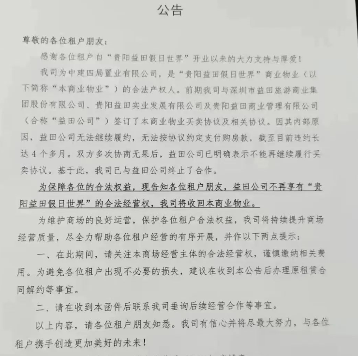 高楼迷曝出的消息,实际上由中建四局置业所发。中建四局置业表示,此前与益田签下过商场物业的买卖协议。但现在因为益田无法继续履约,说白了就是不想给钱,且还违约了四个多月,所以要收回商业物业。