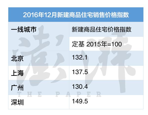 从一二线热点城市来看,房价涨势一度较为明显。以新房为例,按照国家统计局公布的《2016年12月份70个大中城市住宅销售价格变动情况》,以2015年为定基的话,2016年一年时间,北京新建商品住宅销售价格上涨32.1%;上海新建商品住宅销售价格上涨37.5%;广州新建商品住宅价格上涨30.4%;深圳新建商品住宅价格上涨49.5%。
