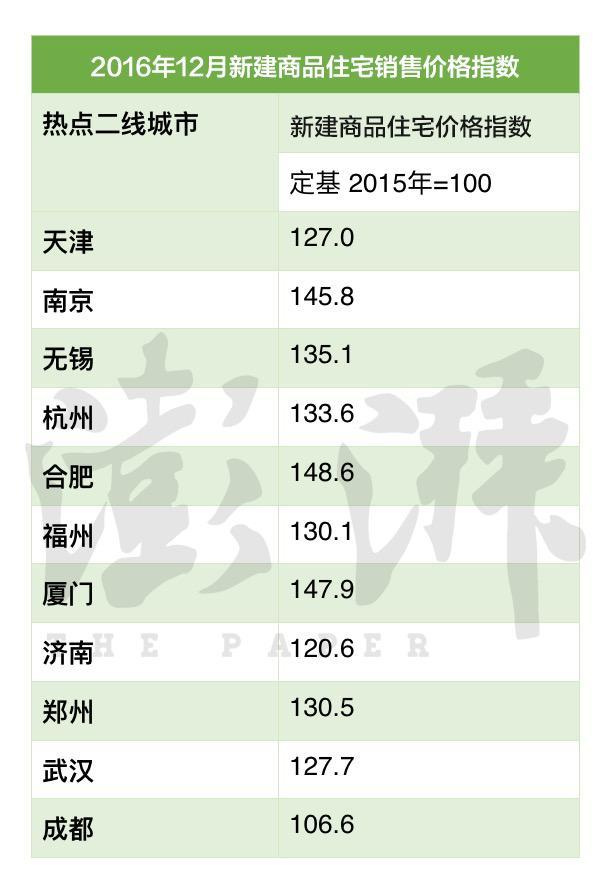2016年这一年,南京新建商品住宅销售价格上涨45.8%,杭州上涨33.6%,武汉上涨27.7%。