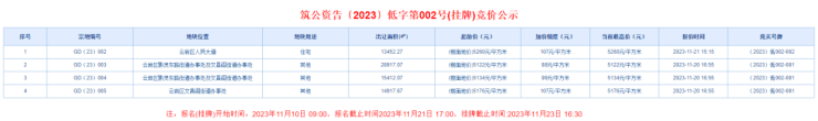 据贵阳市公共资源交易中心土地出让竞价公示信息,云岩区核心象山巷地块、三民东路地块已有人参拍,将于11月23日16:30分正式出让。