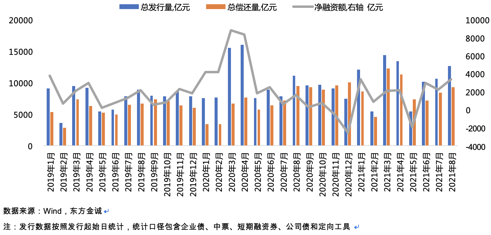 作为信用环境的风向标,信用债的融资情况备受市场关注。根据东方金诚研报统计的数据,8月信用债融资情况持续改善,净融资规模达3377亿元,环比增幅近50%,接近1月高点。