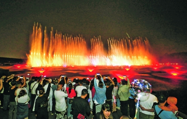 图为10月7日晚,天河潭景区推出了精彩纷呈的水秀节目,吸引众多游客驻足观看。