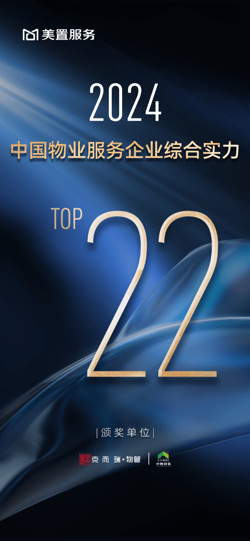 8月22日,2024年中国物业服务企业综合实力榜单发布,美置服务凭借卓越服务力荣膺【2024中国物业服务企业综合实力Top22】。同步获得中国住宅物业服务领先企业、中国产业园区物业服务领先企业等重要奖项。