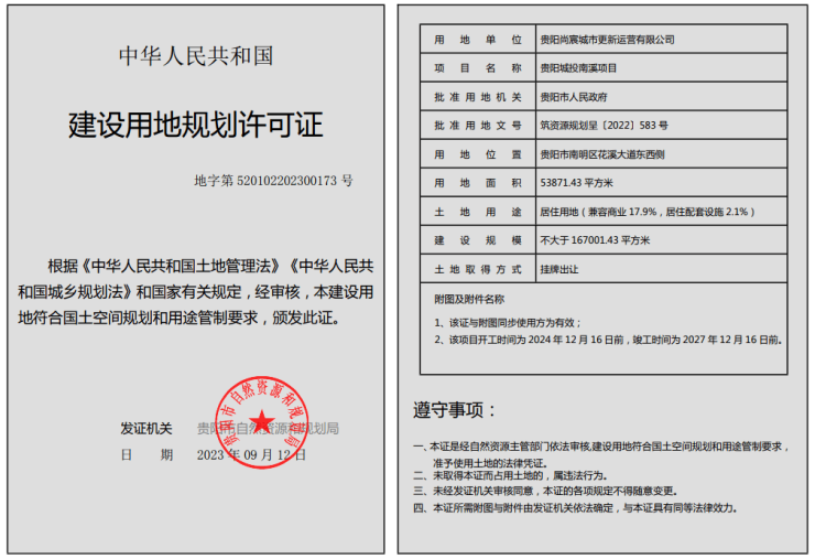 另据贵阳市自然资源和规划局9月12日公示信息,贵阳城投南溪项目已获取建设用地规划许可证。