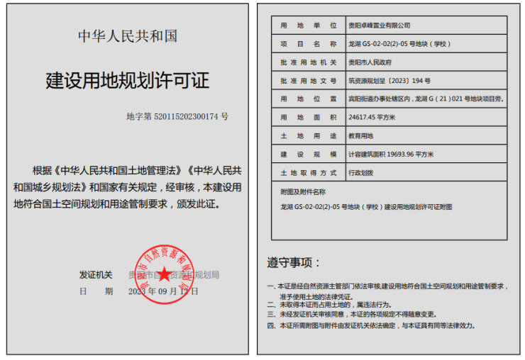 9月12日,贵阳市自然资源和规划局公布了龙湖GS-02-02(2)-05号地块(学校)建设用地规划许可证。