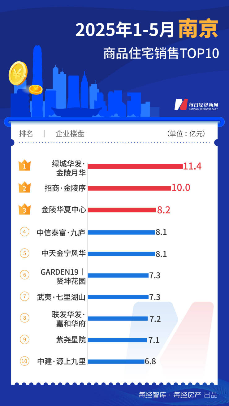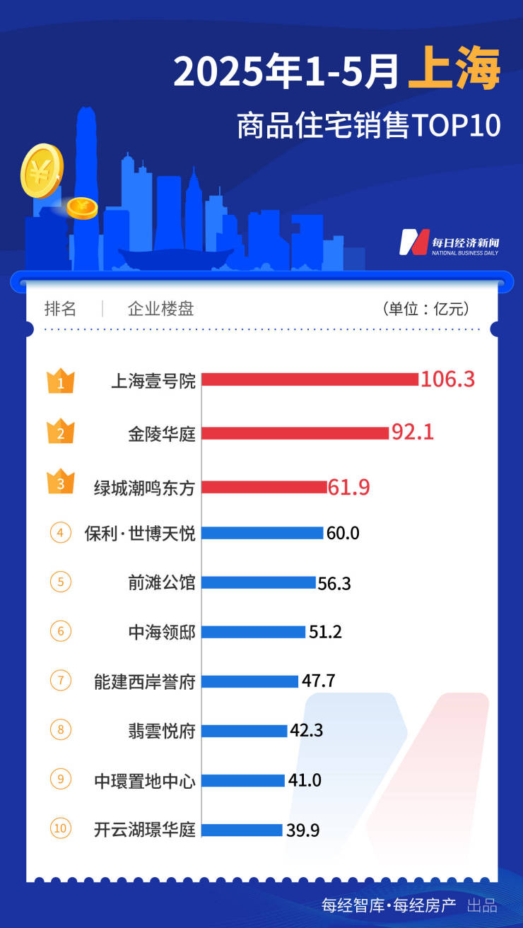 前5个月的全国销冠被上海壹号院摘得,单盘销售106.3亿元;上海金陵华庭销售额92.1亿元,为第二名;上海绿城潮鸣东方销售额61.9亿元,为第三名。