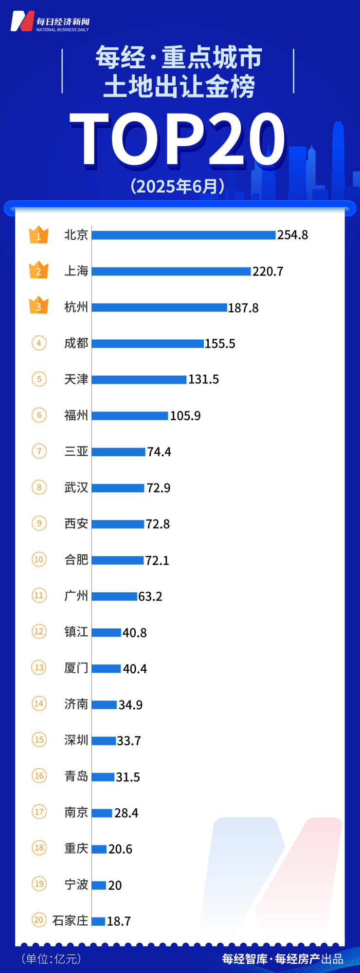 6月份,北京土地出让金为254.8亿元,位列TOP20之首;上海紧随其后,为220.7亿元。全国土地出让金TOP20城市合计达到1681亿元,成为今年以来单月新高。