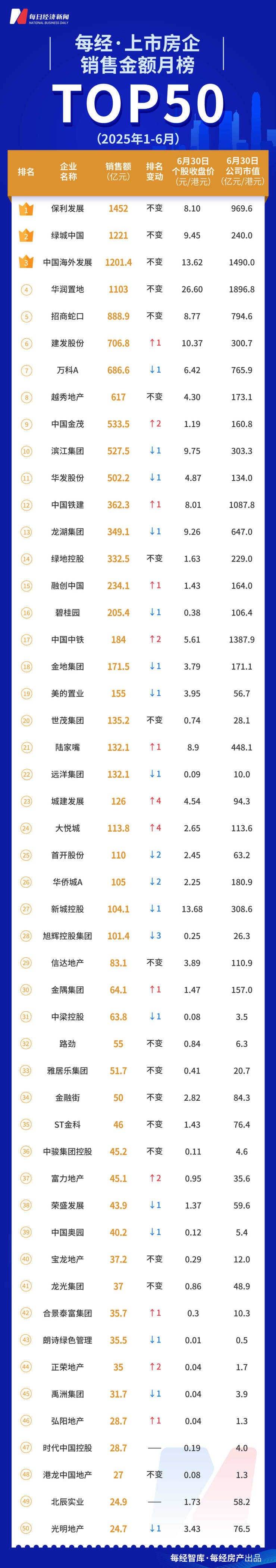 每经数读 | 6月TOP50上市房企销售额创年内新高