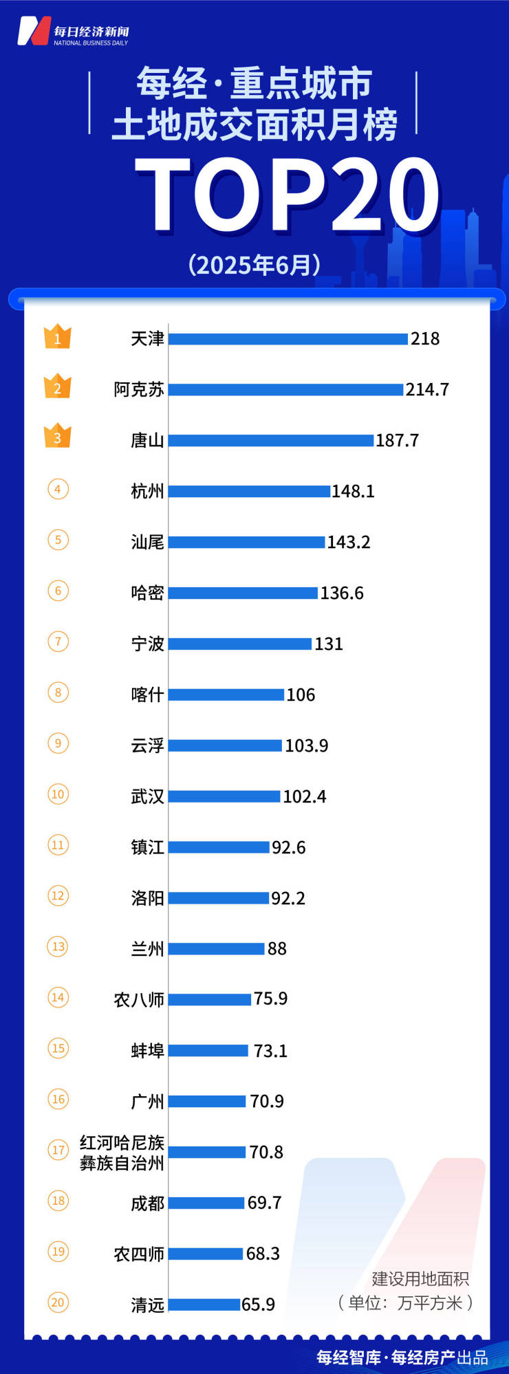 6月份,土地出让面积TOP20城市合计出让土地2259万平方米,略低于前5个月的平均水平。出让面积前三名的城市分别是,天津218万平方米、阿克苏214.7万平方米、唐山187.7万平方米。此外,6月上榜的城市以三四线城市居多,如宁波、镇江、蚌埠、清远等。