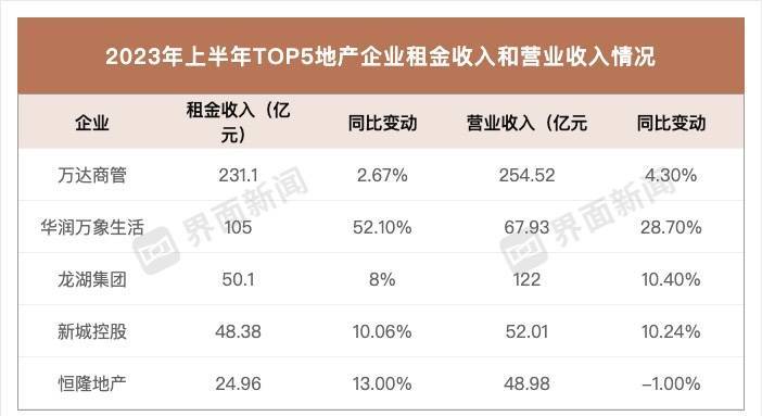 珠海万达商管在国内商业地产领域是绝对的龙头,今年上半年营收和租金收入均排名第一。它的租金收入和营收分别是231.1亿元和254.52亿元,排名第二的是央企华润万象生活,租金收入为105亿元,不到万达的一半,营收为67.93亿元,与万达的差距更大。