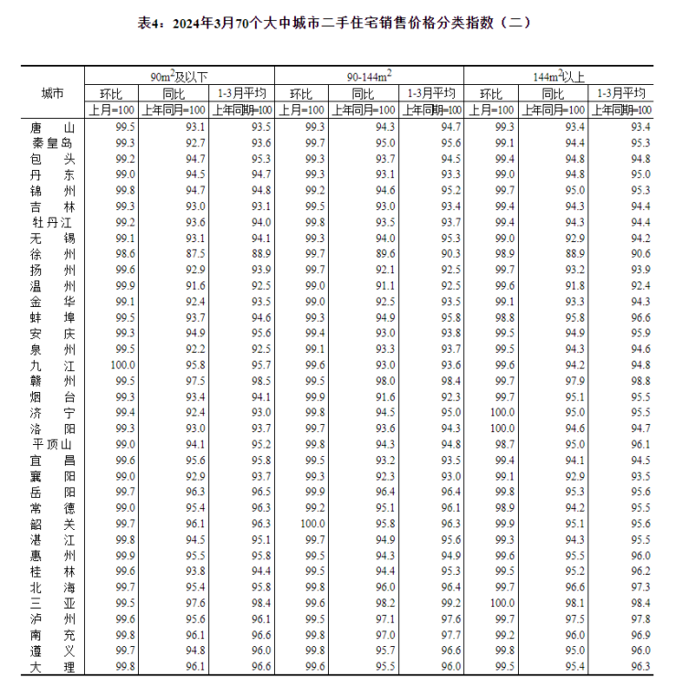 2024年3月份70个大中城市商品住宅销售价格变动情况