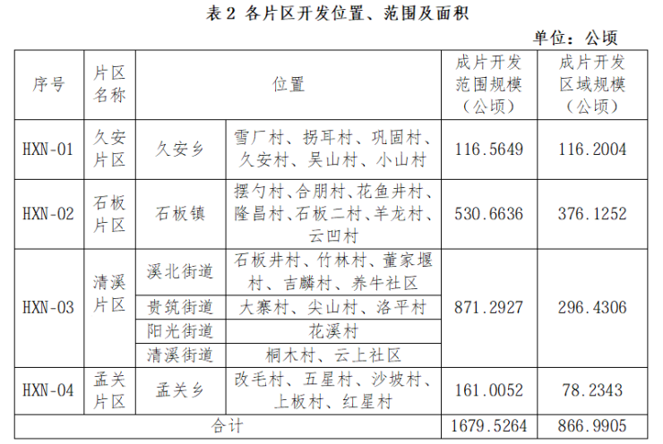 其中包括久安片区、石板片区、清溪片区和孟关片区共四大片区,具体开发范围及开发区域示意图如下。