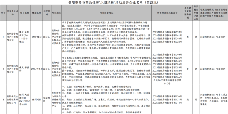 2026年2月28日,贵阳市住建局公示了第四批参与贵阳市商品住房“以旧换新”房地产开发企业及项目名单。