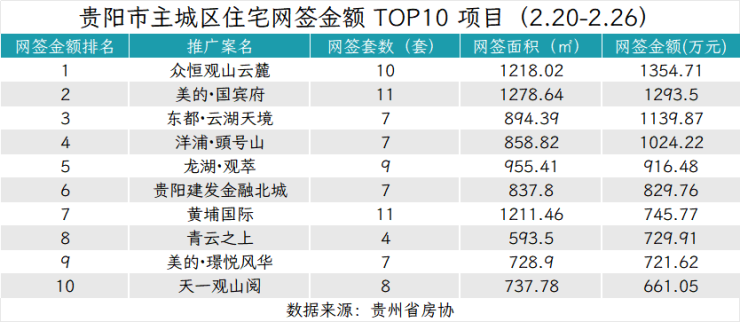 据贵州省房协统计数据,2026年2月20日至2026年2月26日,贵阳主城六区住宅网签金额榜单中: