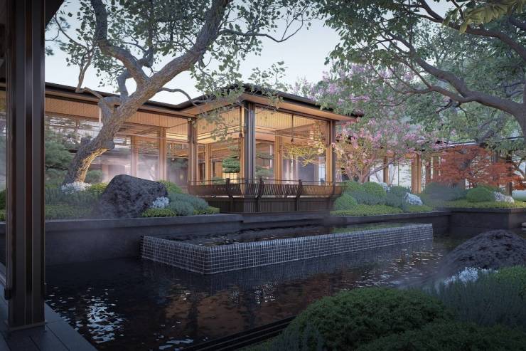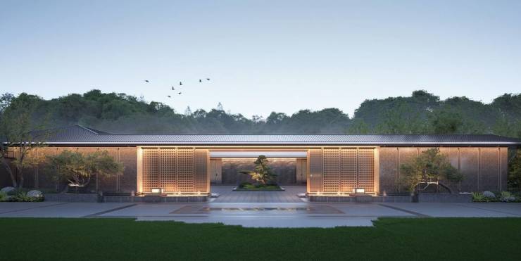 归家,是一场文化仪式。溪山赋以“三进三迎”礼序空间与“三轴七境”山水序列,将归家之路升华为一场沉浸式文化体验。约46米宽的恢弘门堂,以中国画方格纹金属格栅为立面,两侧宫灯与红果冬青、乌桕相映成趣,未入府先见雅韵。穿过门堂,叠石理水、曲水流觞的园林徐徐展开——《千里江山图》的青绿意境与《兰亭集序》的雅集意趣在此交融,石桌、竹影点缀其间,每一步都似在穿越一幅流动的山水画卷。