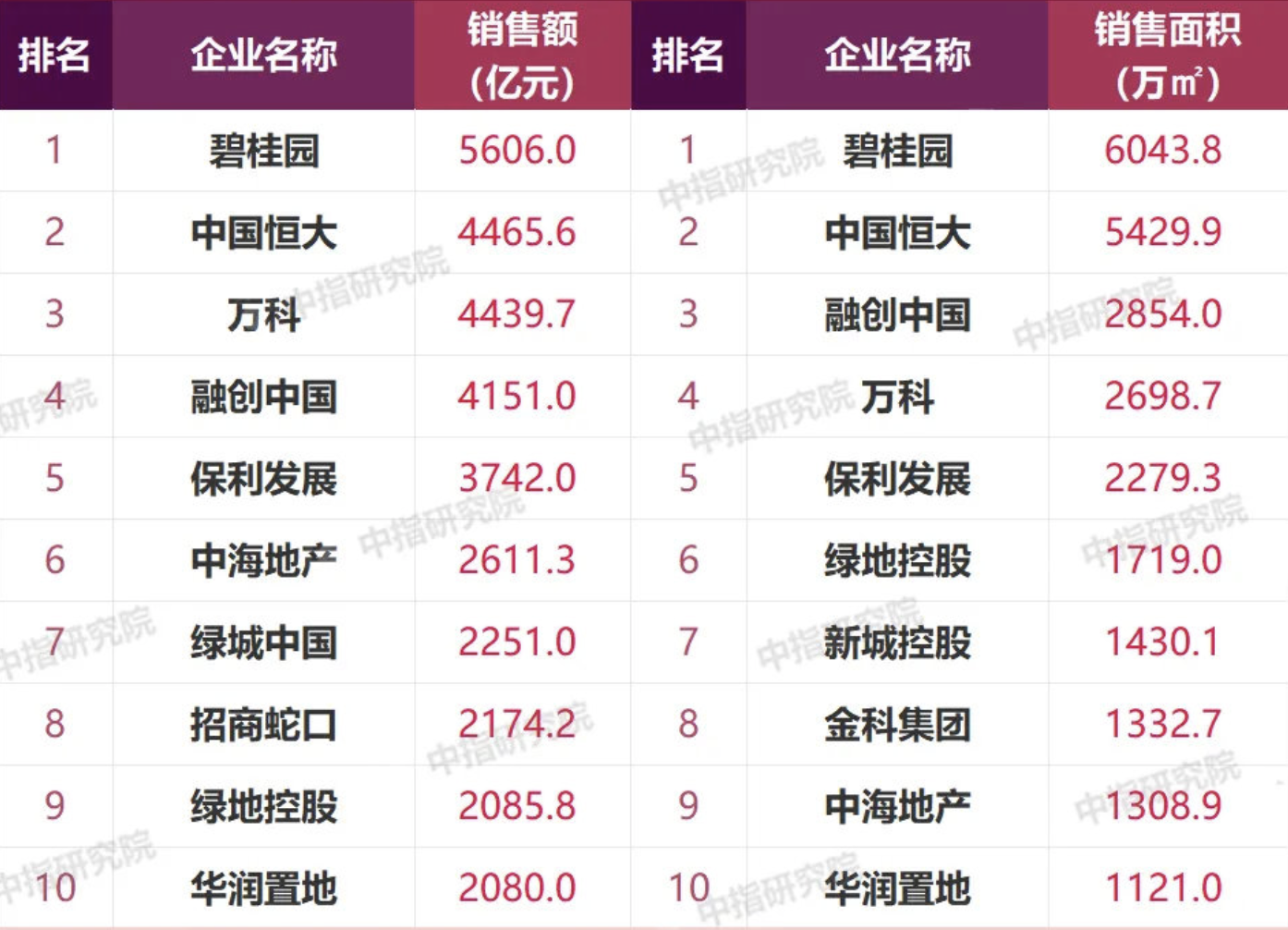 据中指研究院数据,碧桂园仍然以5606亿元销售额稳居榜首,与第二名恒大(4465.6亿元)拉开巨大差距,万科、融创分别以4439.7亿元和4151亿元位列第三、第四。