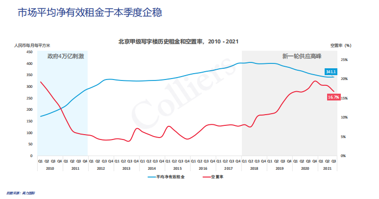 此外,受益于前三季度旺盛的市场需求,高力国际数据显示,北京甲级写字楼空置率进一步降至16.7%,环比下降1.4个百分点;市场租金维持在341.1元每月每平方米,环比微涨0.1%,这也是租金在连续9个季度下跌后首次实现企稳。
