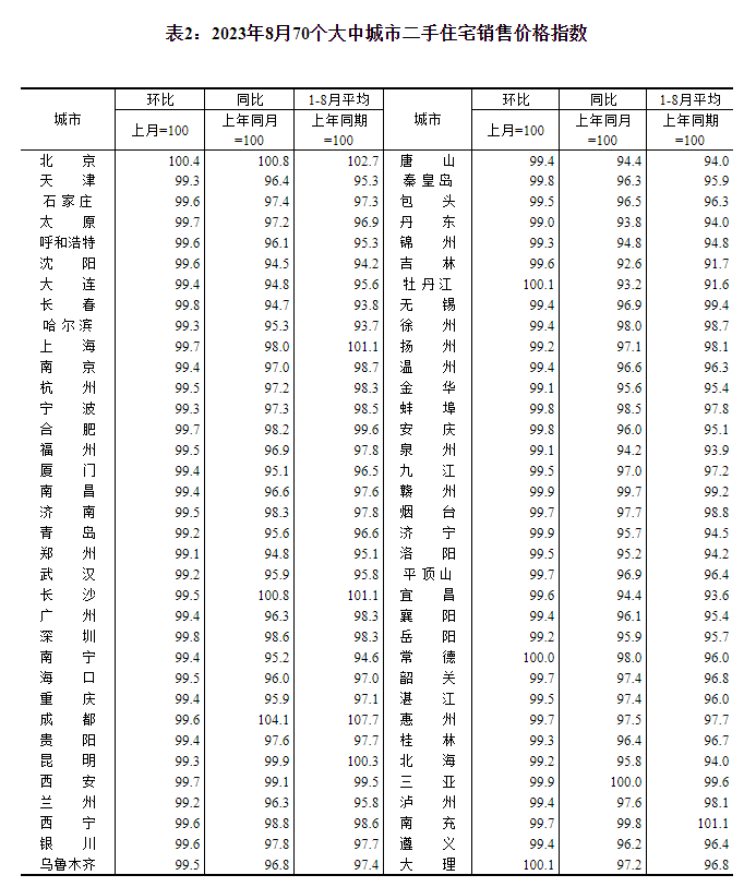 8月份,一线城市新建商品住宅销售价格同比上涨0.6%,涨幅比上月回落0.4个百分点;二线城市新建商品住宅销售价格同比上涨0.3%,涨幅比上月扩大0.1个百分点;三线城市新建商品住宅销售价格同比下降1.4%,降幅比上月收窄0.1个百分点。8月份,一、二线城市二手住宅销售价格同比分别下降1.6%和3.0%,降幅比上月分别扩大0.2和0.3个百分点;三线城市二手住宅销售价格同比下降3.5%,降幅与上月相同。