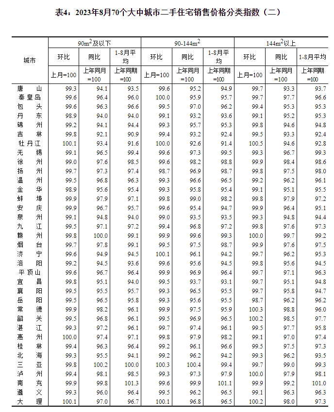 从新建商品住宅看,8月份,一线城市新建商品住宅销售价格环比由上月持平转为下降0.2%,其中北京、广州和深圳环比分别下降0.2%、0.3%和0.6%,上海环比上涨0.1%;二线城市新建商品住宅销售价格环比下降0.2%,降幅与上月相同;三线城市新建商品住宅销售价格环比下降0.4%,降幅比上月扩大0.1个百分点。从二手住宅看,8月份,一线城市二手住宅销售价格环比下降0.2%,降幅比上月收窄0.6个百分点,其中北京环比上涨0.4%,上海、广州和深圳环比分别下降0.3%、0.6%和0.2%;二、三线城市二手住宅销售价格环比分别下降0.5%和0.4%,降幅均与上月相同。