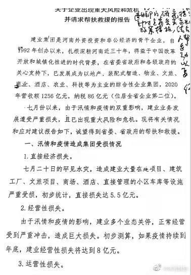 这封题为《关于企业出现重大风险和危机并请求帮扶救援的报告》的“求助信”称,“如果建业被汛情疫情拖累,过不去眼前这个坎,有可能成为全国企业‘暴雷’和倒下的‘下一个’,其消极反响将是全国性的、极为严重的。”