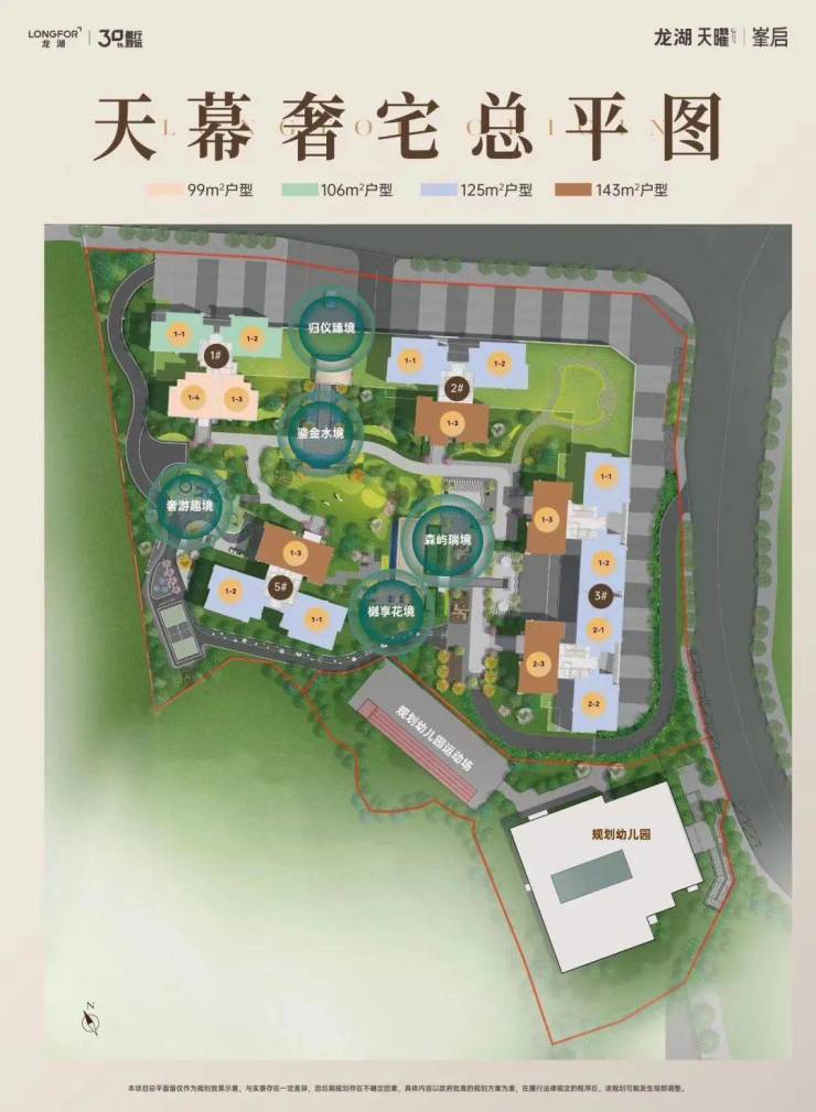 四期一共5个单元4栋楼,采用合围式排布。受制于地块面积,合围中庭面积不大,但从规划图上看,龙湖还是为其设置了较为丰富的植被和功能。