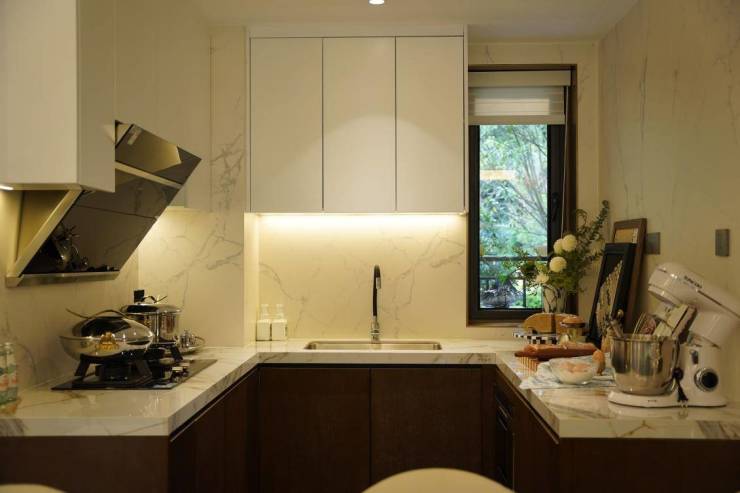 同时,在厨房方面,保利时代同样对标大户型的标准,创造性地在89㎡的空间内打造了U型厨房,可以同时容纳约3-4个人享受做美食的乐趣,体验精致生活。并且,厨房还与入户门和北向生活阳台紧密相连,让生活垃圾可以快速清理出门外或阳台,设计得很有心思和生活细节。