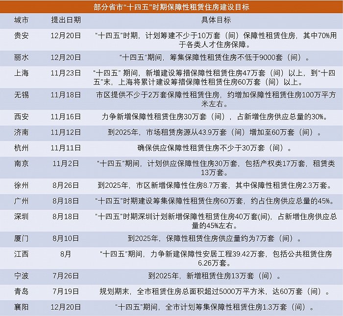 12月20日,湖北襄阳明确,在“十四五”期间,计划筹集保障性租赁住房1.3万套(间)。同日,贵阳贵安也提出,规划期间计划筹建不少于10万套(间)保障性租赁住房,且租金按市场租金的80%左右确定 。浙江丽水市也于近日明确,规划期间将筹集保障性租赁住房不少于9000套(间)。