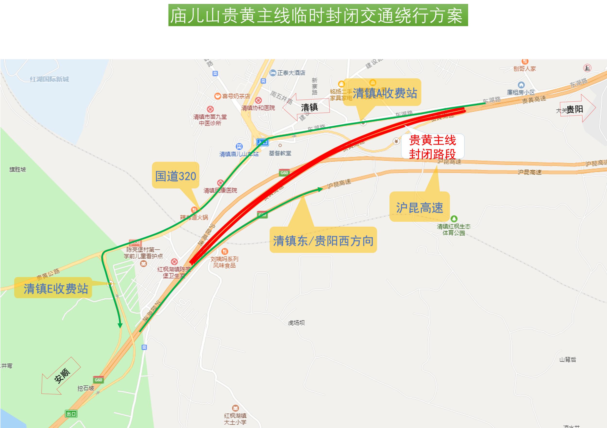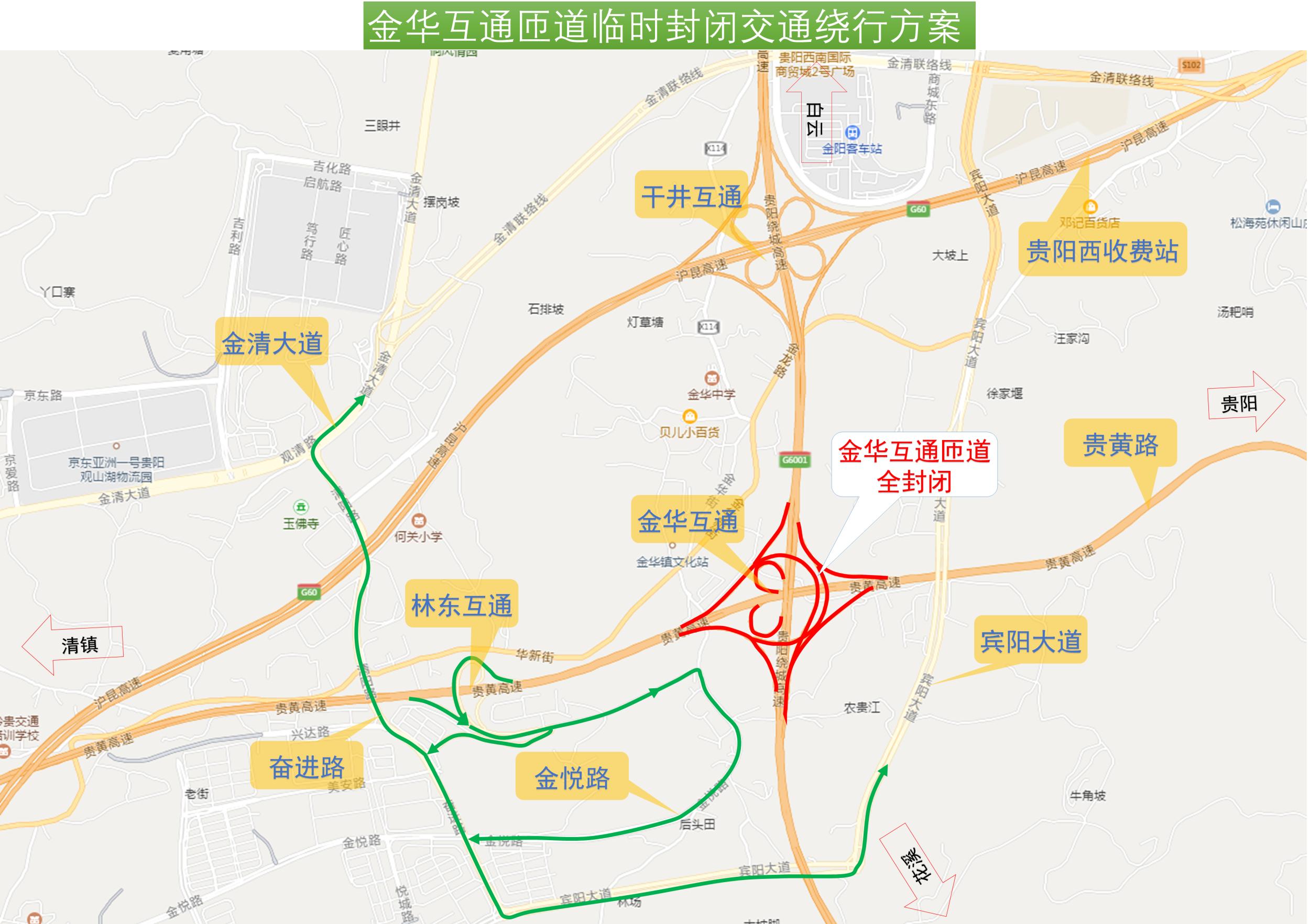 从环城高速往返林东收费站、贵黄公路的车辆,改由贵阳西收费站、北京西路、宾阳大道、奋进路通行;从清镇方向往返环城高速的车辆,改由清镇东收费站、沪昆高速进出;从安顺方向往返贵黄公路的车辆,改由清镇E收费站、东湖路进出。
